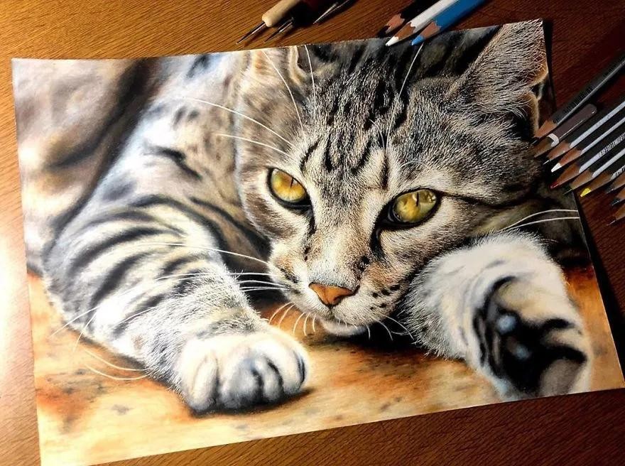 这位艺术家是来自日本的工藤春树,他很擅长用彩色铅笔画各种动物。可能是因为工藤春树喜欢猫咪的缘故,他笔下的猫咪最让人惊艳。