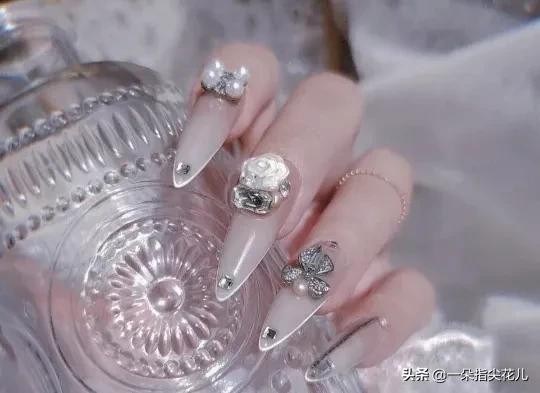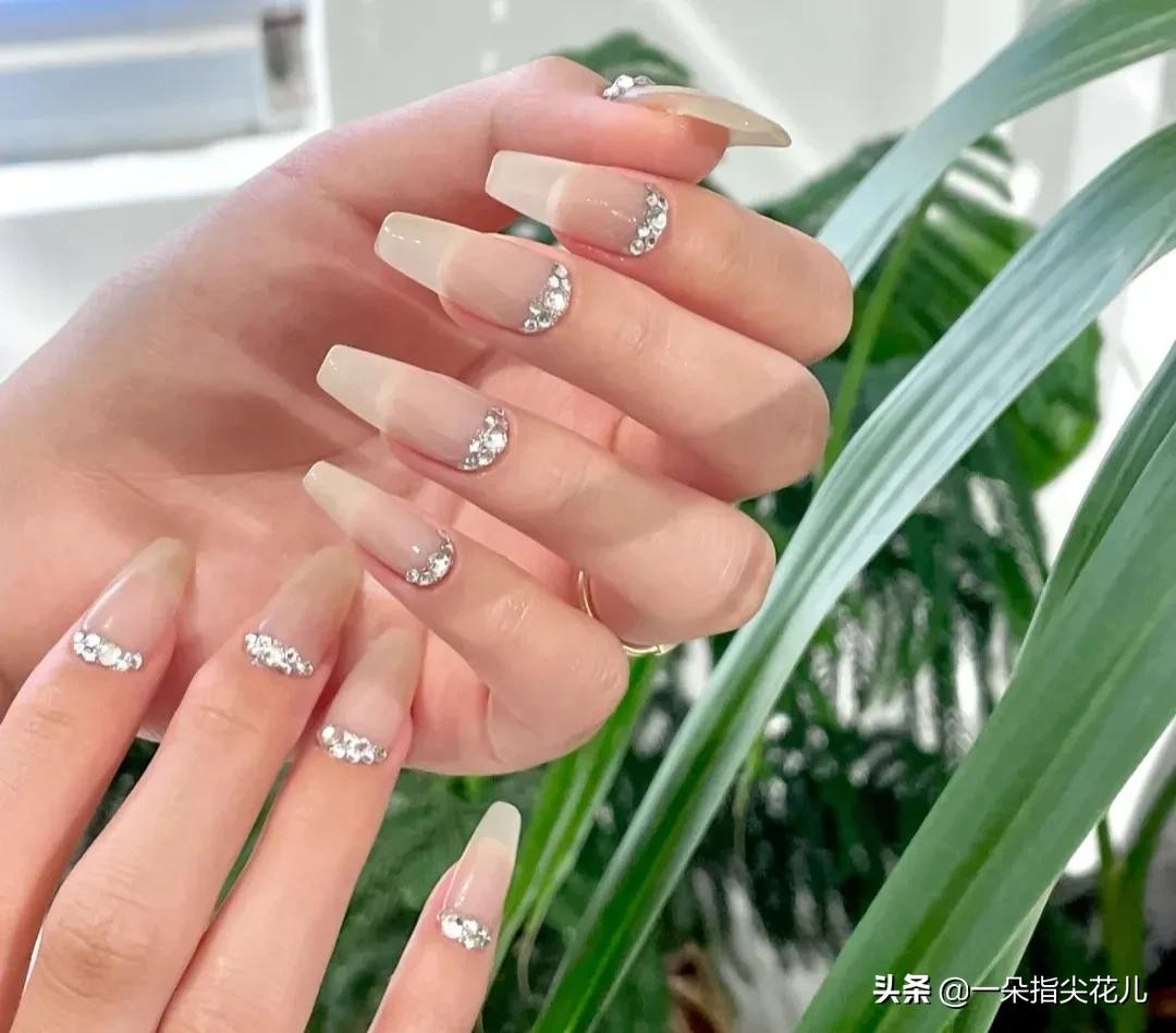 第一款:果冻色(透白偏黄)指跟银色铂金胶打底,上边贴平底白钻。