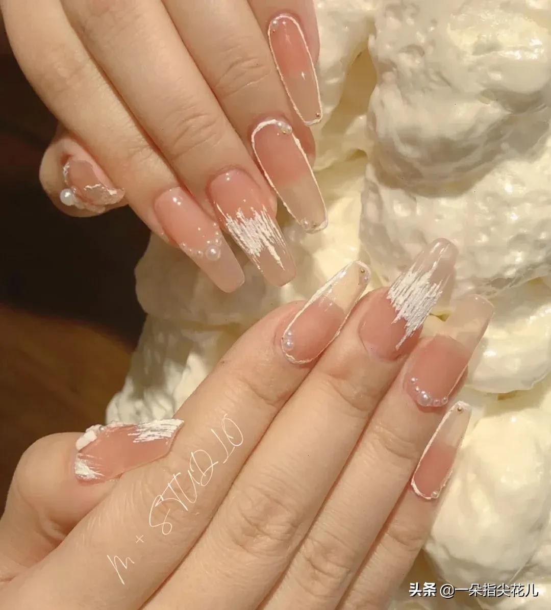 第十款:果冻粉色打底,搭配珍珠,钢珠,画白色石膏胶。