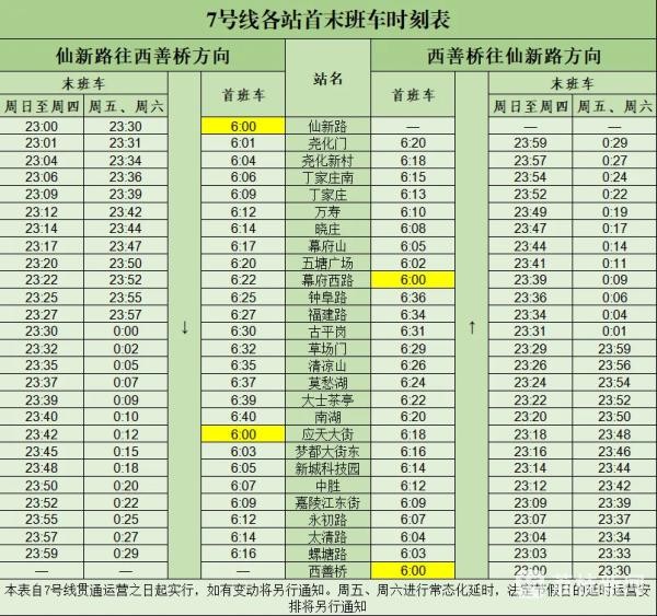 据了解,南京地铁7号线全线采用西善桥站至仙新路站的单一交路方式运行。西善桥往仙新路方向于西善桥站和幕府西路站设首班车,仙新路往西善桥方向于仙新路站和应天大街站设首班车,首班车发车时间维持6:00不变;周日至周四两端末班车发车时间为23:00,周五至周六组织常态化延时,两端末班车发车时间为23:30。南京地铁运营公司七号线分公司党委副书记毛一轩告诉记者:“中间多加一班车,对于中途比如应天大街上、幕府西路站的乘客来说,也可以在早上6点钟乘上第一班车了。”