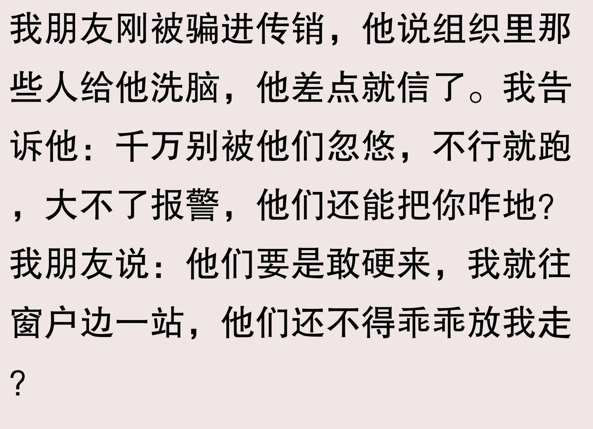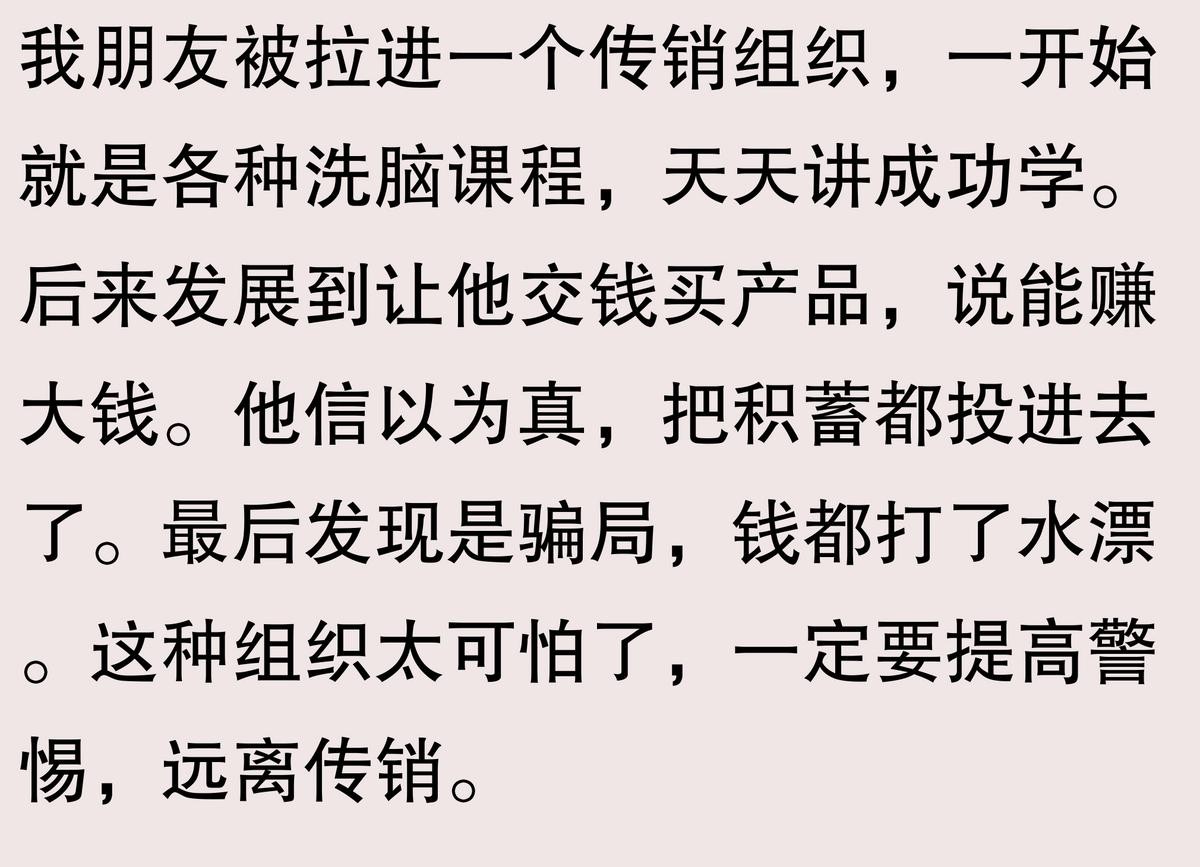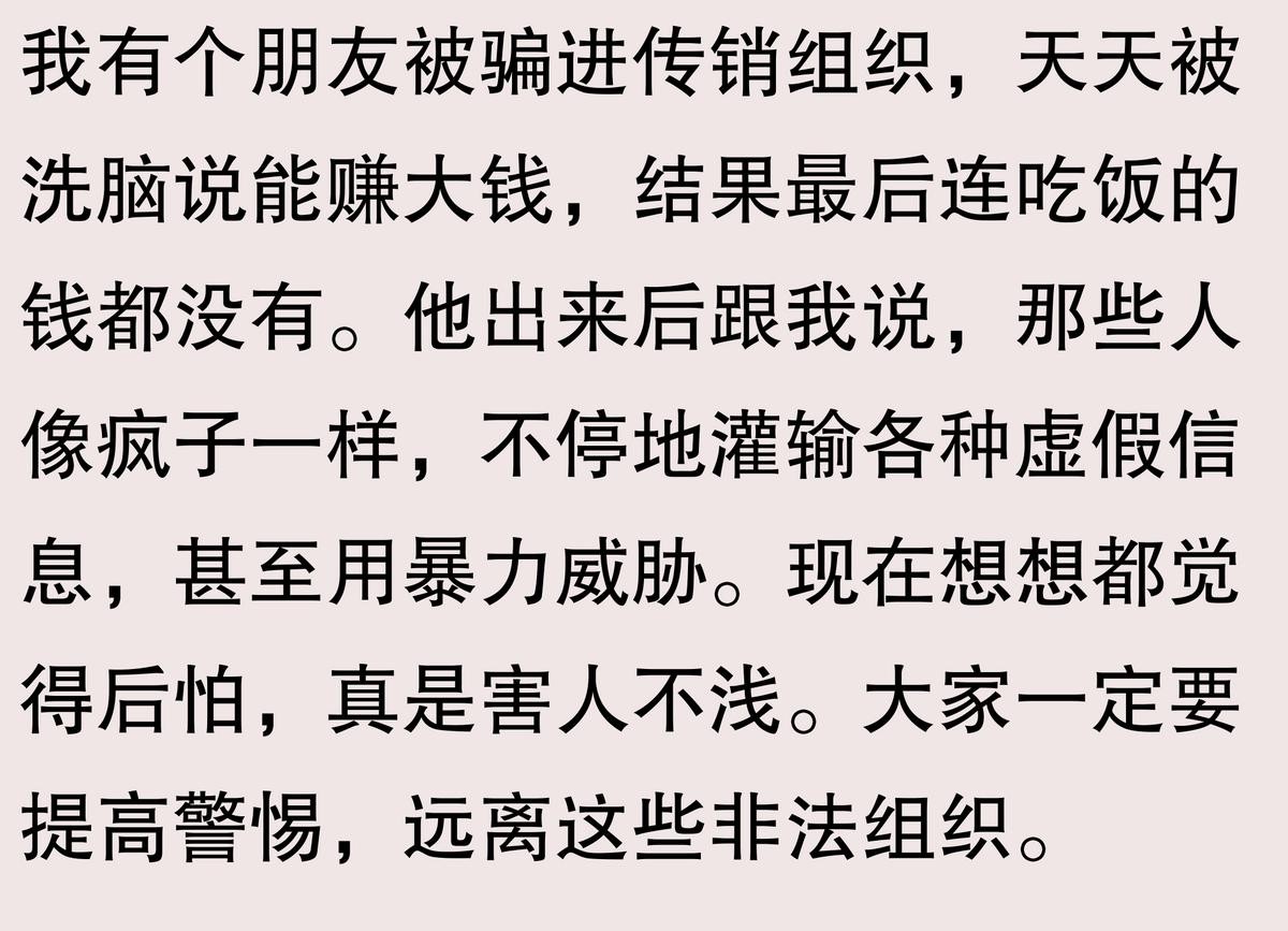 我舅舅被传销组织骗进去,天天打电话要钱,家里人都劝他出来,他不听,后来被洗脑到连自己名字都忘了,最后被警察救出来时已经疯了,现在还在精神病院。