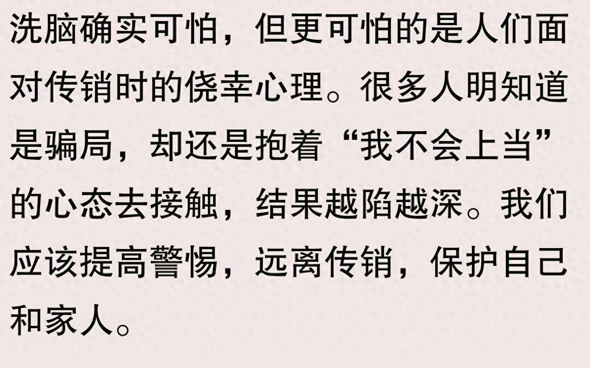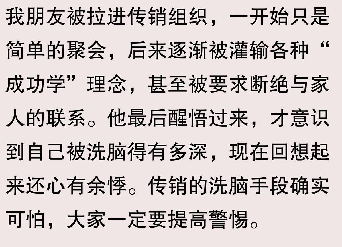 那是零几年的时候,朋友被拉进一个传销组织,刚开始只是听课,后来逐渐被洗脑。他们用各种手段控制人的思想,让人相信一夜暴富的谎言。朋友在里面待了几个月,整个人都变了,连家人都不认。最后家人报警,才把他救出来。从那以后,朋友再也不敢轻易相信陌生人了。