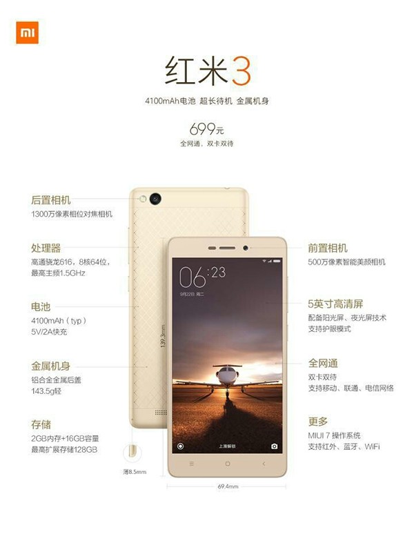 红米3价格配置完全曝光 699元12日开卖