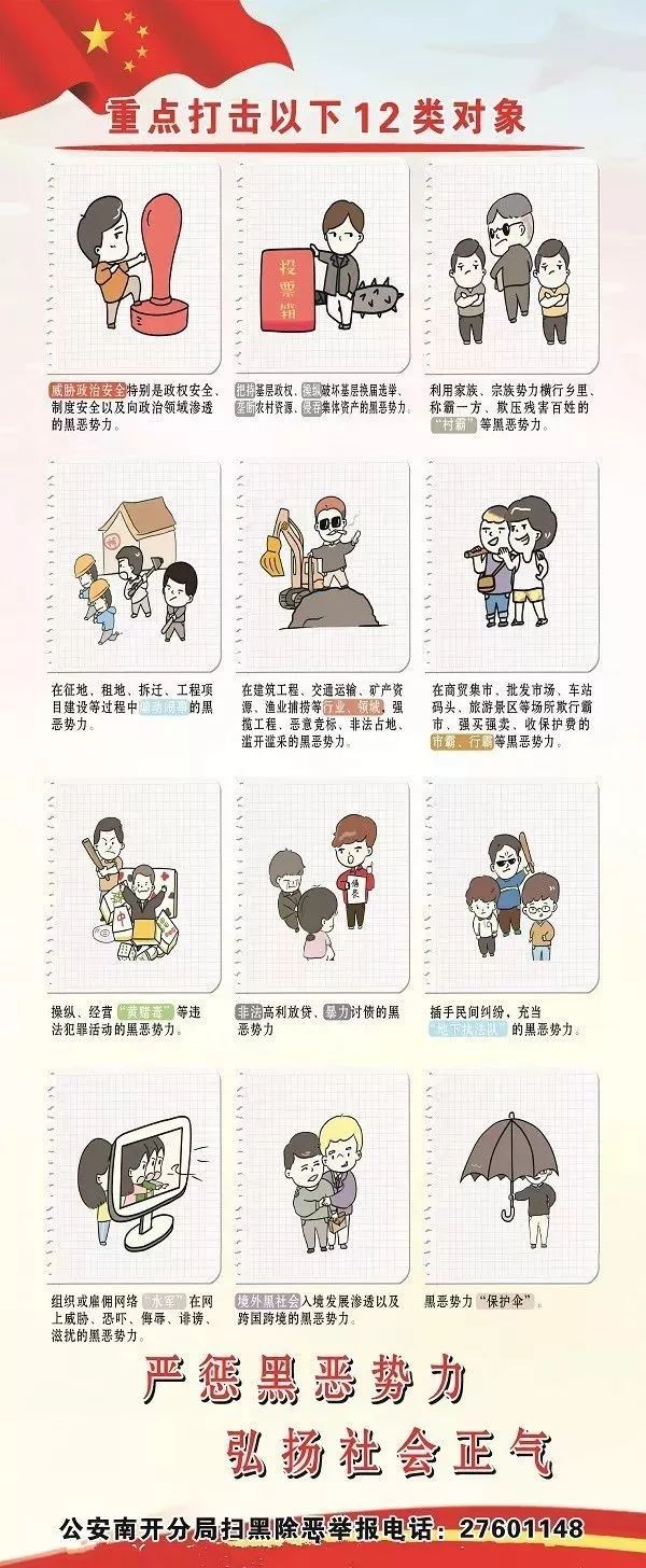王顶堤派出所特地制作了宣传海报,以动漫人物的形式诠释了扫黑除恶工作中重点打击的十二种“黑恶势力”。