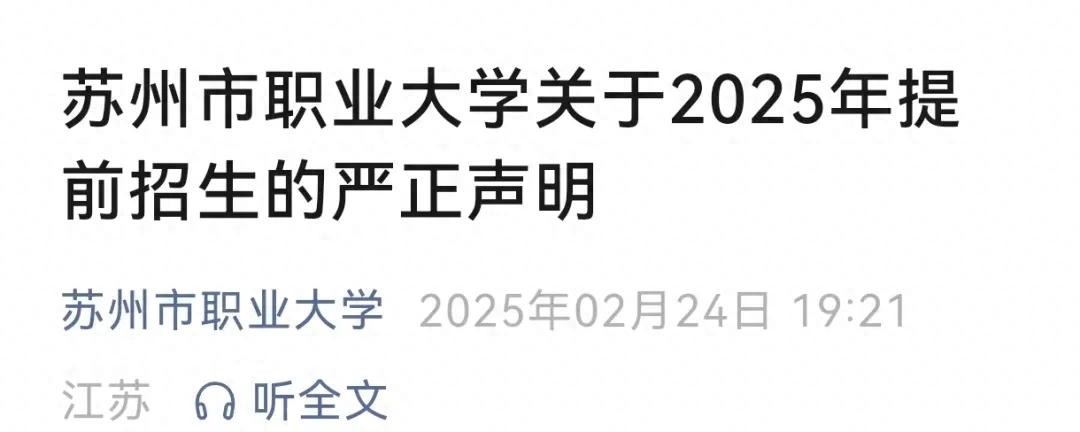 近期,学校注意到有不明人员、网站和机构,利用苏州市职业大学名义或假冒苏州市职业大学教师、工作人员、在校学生等身份,发布虚假苏州市职业大学2025年提前招生信息;或通过短信、微信、QQ、电话、小红书、抖音、头条等社交平台,与考生和家长联系,诱导登记个人信息,进行所谓官方“在线答疑”,肆意引流散布虚假苏州市职业大学提前招生职业适应性测试信息,推销所谓提前招生职业适应性测试培训,诱骗考生及家长缴费,开展商业活动等。这些行为严重扰乱了我校的招生秩序,严重损害了广大学生的利益和我校的声誉。