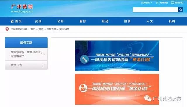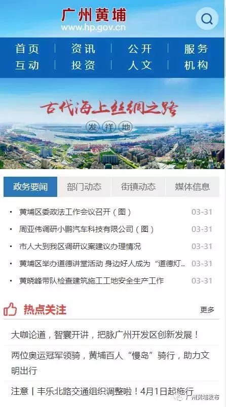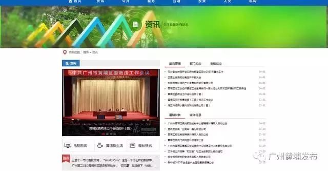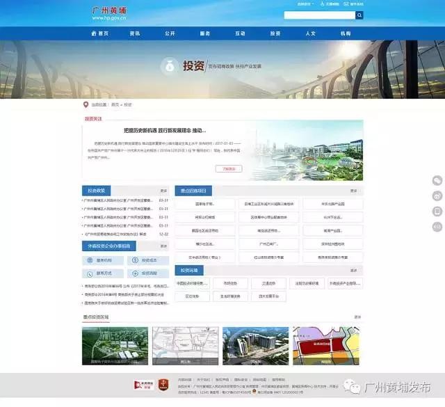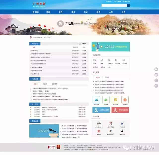 三幅形象图开幕后,网站首页主体部分升起,公众在首页通过切换热点关注、政务公开、办事服务、互动交流、投资黄埔五个页签就可以了解全站重点内容。