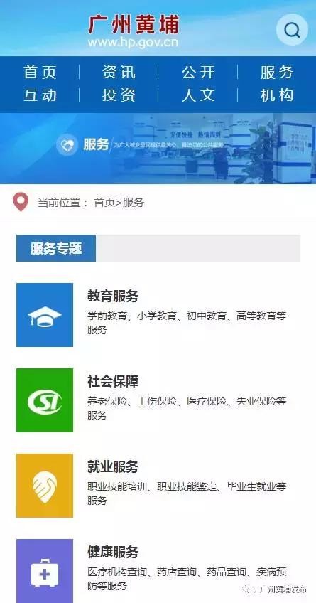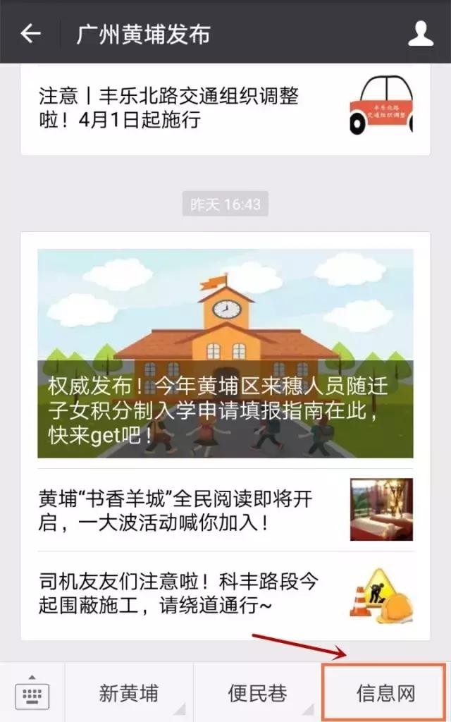 方式二:关注官方微信公众号“广州黄埔发布”,点击底部菜单栏“信息网”,即可直接进入手机版黄埔信息网。