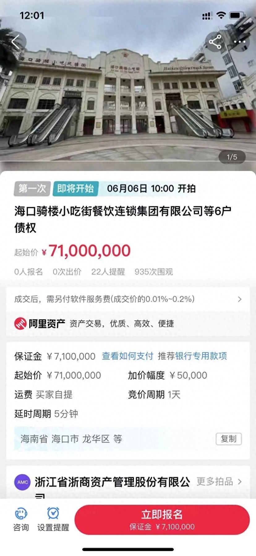 这次的拍卖,是债权转让,起拍价是7100万,包含了6个抵押物,海口骑楼小吃街(部分房产)只是其中一个,目前仍没人报名,老谈猜测,明天大概率会流拍。