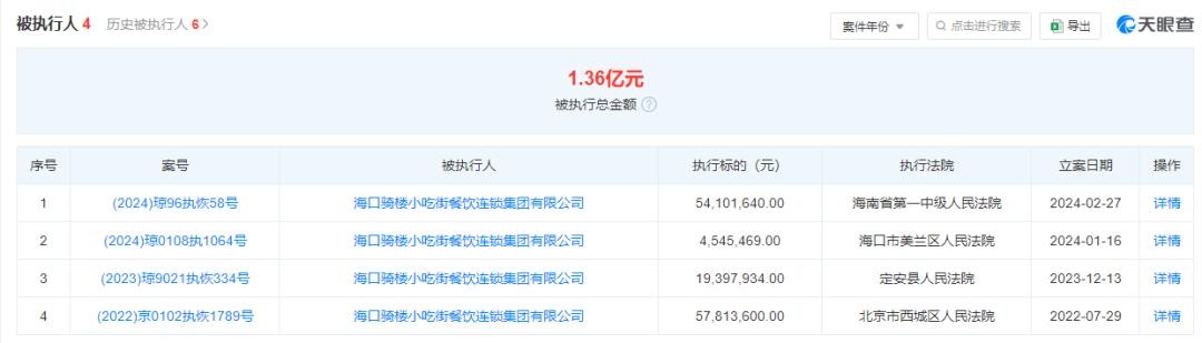 网上也查询到海口骑楼小吃街餐饮连锁集团有限公司被执行了4条。