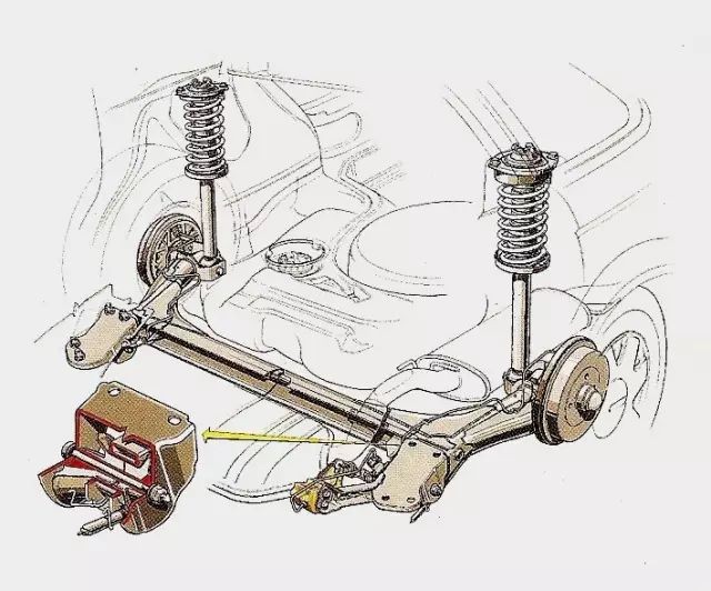四驱的Syncro车型的后悬架为单斜臂独立式,比两驱车型的后扭力梁悬架(板车)复杂许多,下图就是桑塔纳的扭力梁悬架,大家应该都很熟悉吧
