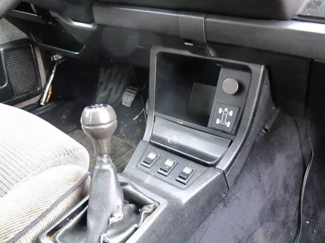 与奥迪80quattro的四驱系统相同,属于全时四驱,中央差速器和后桥差速器可以手动锁止,由此可见四驱系统还是很强大的。注意下图的差速锁操纵钮和差速器锁止指示灯