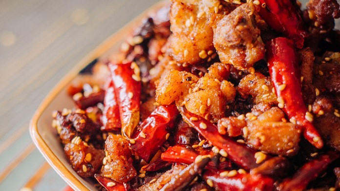 5、锅留底油大火烧热姜蒜爆香,放辣椒段和花椒炒香。