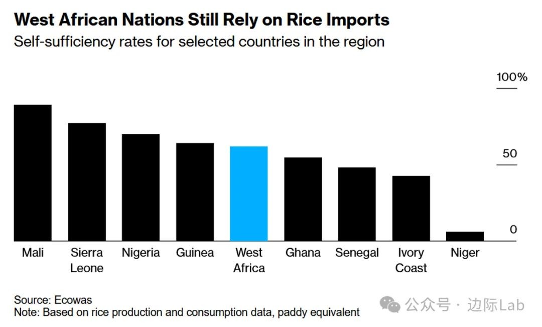2.西非国家经济共同体(ECOWAS)数据显示,西非国家约40%的大米依赖进口,自给率普遍较低,这一比例小于非洲大陆的约40%。2023年印度限制大米出口一度导致全球米价飙升,凸显了非洲粮食安全的脆弱性。
