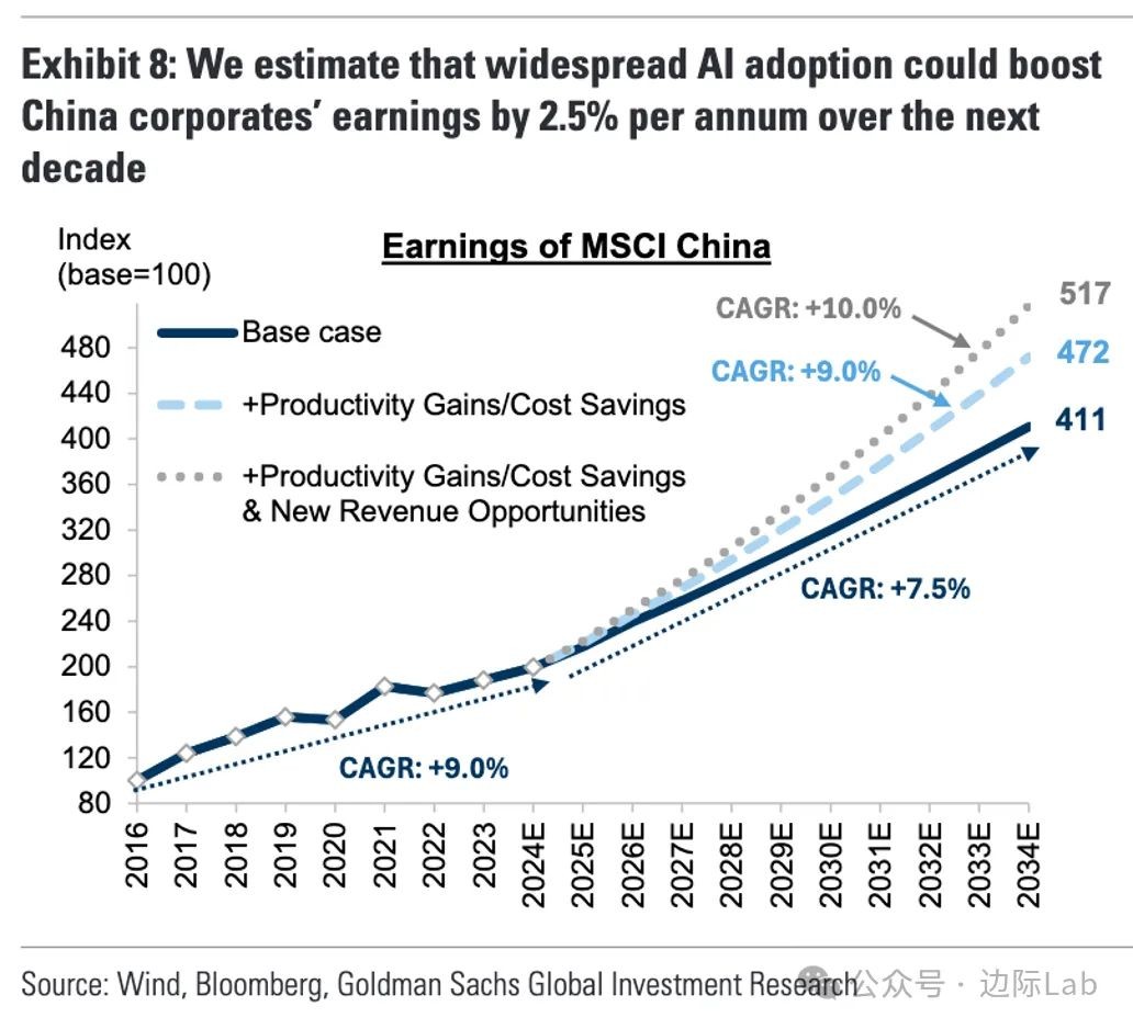 1.高盛表示,人工智能(AI)未来十年或将推动中国企业年均盈利增长2.5%,主要通过生产力提升、成本节约和新收入机会三大途径实现。生产力提升:若企业利用AI提高劳动生产率,MSCI中国指数成分股年均盈利增速可提高1.1%;成本节约:假设AI通过自动化和劳动力优化降低3%的人工成本,企业盈利每年可提升1.8%;新收入机会:技术投资推动新商业模式发展,预计未来十年可额外贡献1%的年均盈利增长。