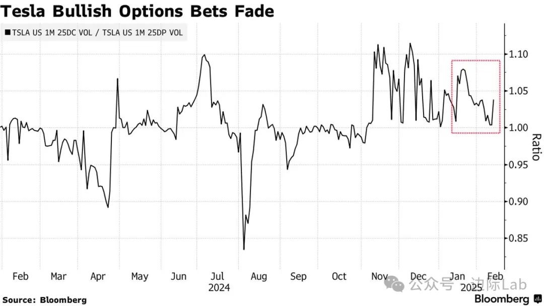 5.尽管特斯拉仍然保持着高估值,但市场对其未来增长的信心正逐渐减弱。特斯拉的市盈率目前为119倍,远高于“七巨头”平均的30倍,以及标准普尔500指数的22倍。这一估值意味着该公司未来一年的收益将跃升约30%,而根据彭博的数据,分析师平均预计其2025年的利润将增长19%。这种高估值也意味着任何失望的消息都可能导致股价大幅下跌,特别是特斯拉近期期权市场上的买盘开始减弱,波动率上升,表明交易员开始为潜在的股价下跌支付更多期权费。