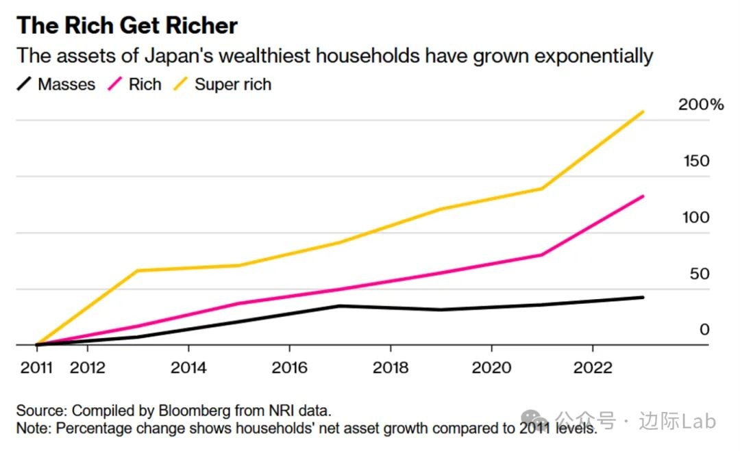 1.日本野村研究所(NRI)数据显示,日本富裕家庭和超级富裕家庭持有的资产价值已升至创纪录的469万亿日元(约合3.1万亿美元),从2011年到2023年分别增长了一倍多和两倍多;而占日本家庭总数约80%的大众家庭的资产仅增长了42.2%。财富差距日益扩大主要反映在股票收益上,因为高净值家庭持有的股票通常较多。2023年,日本最富有的3%的家庭持有该国家庭净资产的26%。