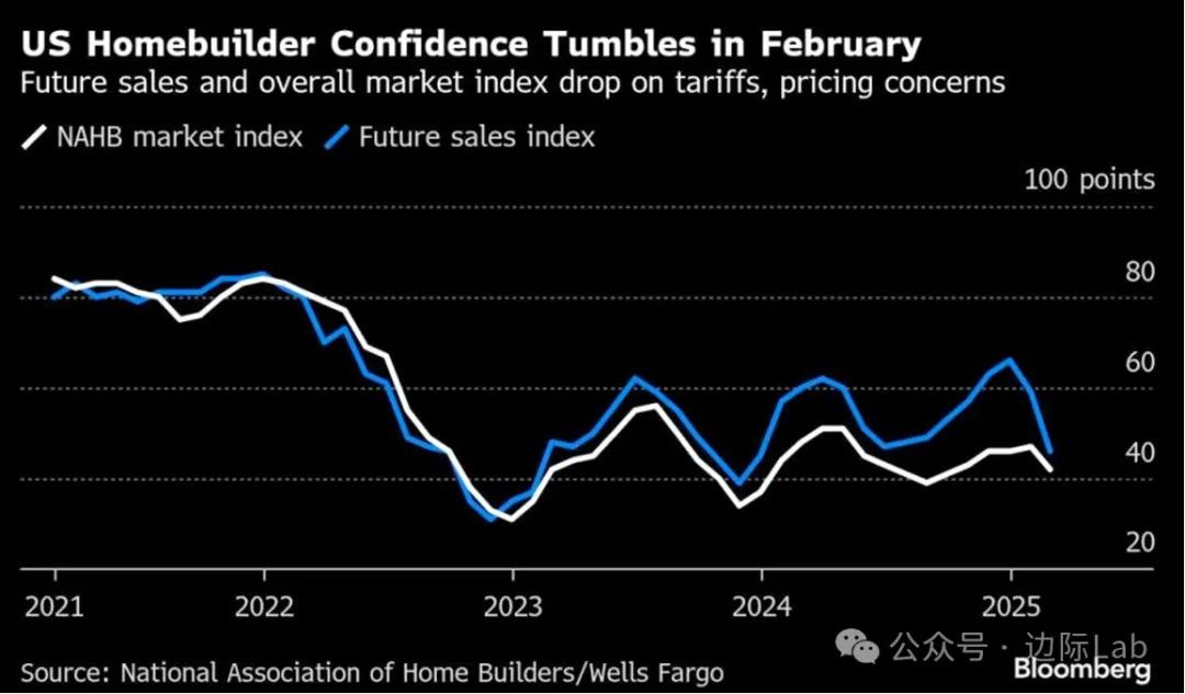 2.受抵押贷款利率高企和关税担忧影响,2月份全美住宅建筑商协会(NAHB)美国住宅建筑商信心指数降至42点,为去年9月以来最低,低于市场预期。其中,对未来六个月市场预期的分类指数大跌13点至46,创疫情初期以来最大降幅,反映建筑商信心急剧下降。此外,当前销售情况和潜在买家流量指标也同步下滑。