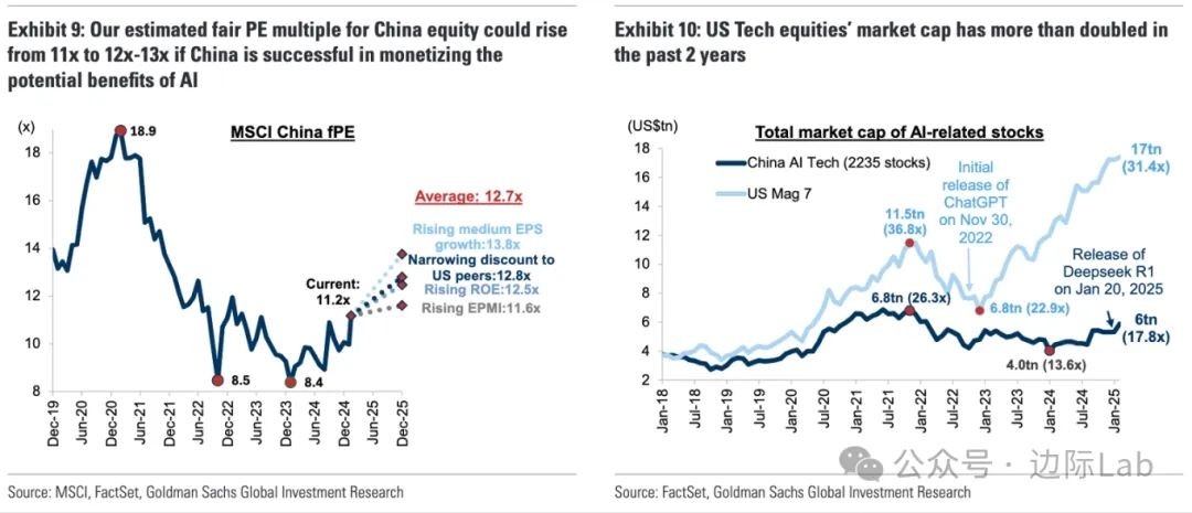 2.高盛表示,如果人工智能(AI)带来实际收益,中国的股票估值或将提升15-20%,主要基于以下分析。1.盈利增长:假设AI推动每股收益(EPS)年均增长2.5%,在股息折现模型(DDM)下,企业公允价值将上升25%;2.股本回报率(ROE):经验数据显示,ROE提高0.3%(对应2.5%的利润增长)可令市场估值上调13%;3.中美科技股估值收敛:若中国科技股与美国同行的EPS增长和ROE水平部分趋同,市净率(P/B)折扣可从75%缩窄至47%,推动科技股估值提升56%,基准指数估值增长16%;4.市场信心回升:中国新兴产业企业信心指数(EPMI)若从当前的48回升至55,指数市盈率(PE)将提升5%。