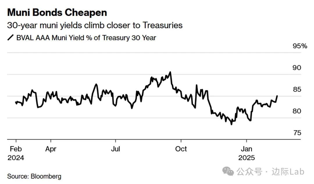 8.美国30年期市政债券收益率已升至同期美国国债收益率的85%左右,创去年11月特朗普胜选以来最高水平。2月份,美国30年期市政债券发行量同比增长27%,达到约210亿美元,拖累了市政债券的价格。联邦税收政策的不确定性以及市场对政府削减开支措施的担忧也导致了市政债券的疲软。