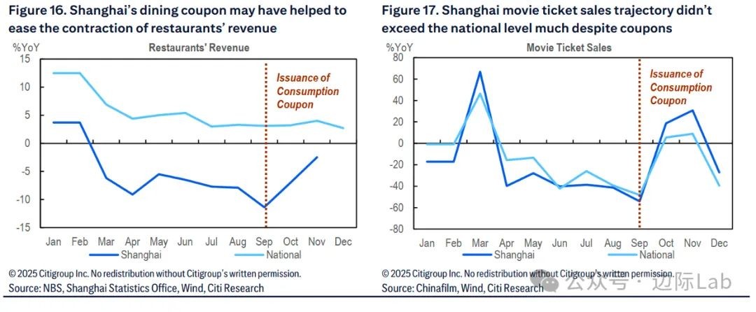 6.2024年9月,上海开始发放5亿元人民币消费券。数据显示,上海餐饮收入的降幅在消费券发放后缩小;同时,上海电影票房收入虽有所改善,但表现未显著优于全国水平。这意味着,消费券并非“万能药”,其刺激效果可能因行业不同而有所差异。