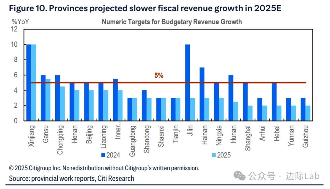 4.2025年,各省预计财政收入增速将放缓,印证了市场对财政政策更趋务实的预期。20个设定具体目标的省份中,大多数下调了财政收入增速目标,仅新疆和吉林的目标高于5%。这一调整并非因减税政策,而是地方政府在2024年面临财政紧张后目标变得更加现实。这意味着2025年财政支出可能更多依赖债务融资和中央政府转移支付。