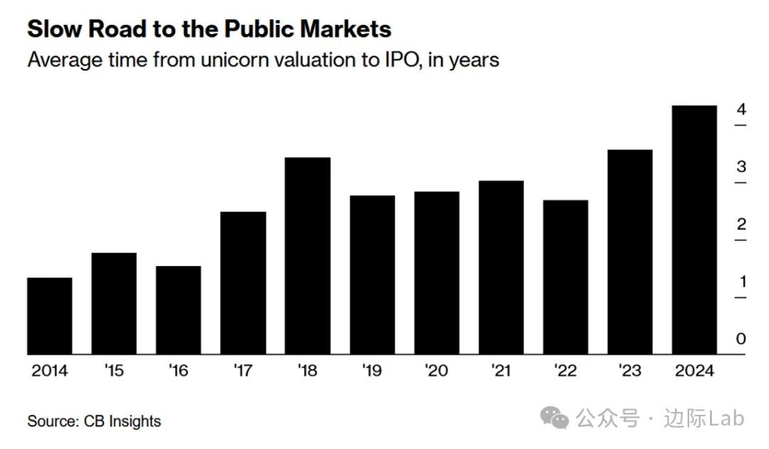 独角兽企业从估值达到10亿美元到首次公开募股(IPO)的平均时间越来越长。CB Insights数据显示,2014年独角兽企业这一平均时间约为1.5年,而2024年则达到近4年。