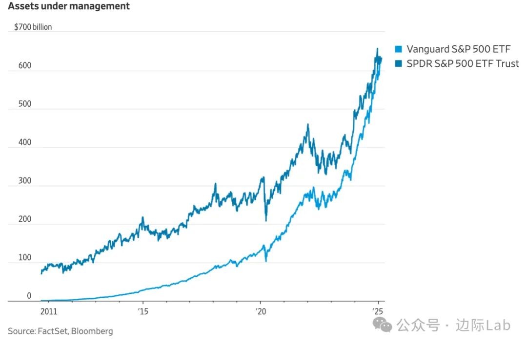6.Vanguard的标普500 ETF已成为全球资产规模最大的ETF,取代了State Street的SPDR S&P 500 ETF(SPY),后者在过去近30年一直保持这一地位。尽管两只基金本质上相同,但Vanguard基金的快速增长反映出投资者更倾向于成本更低的产品。目前,Vanguard的标普500 ETF年费率为0.03%,低于SPY的0.09%。不过,SPY在二级市场的交易量更大,因此仍是机构投资者调整市场敞口的主要工具。