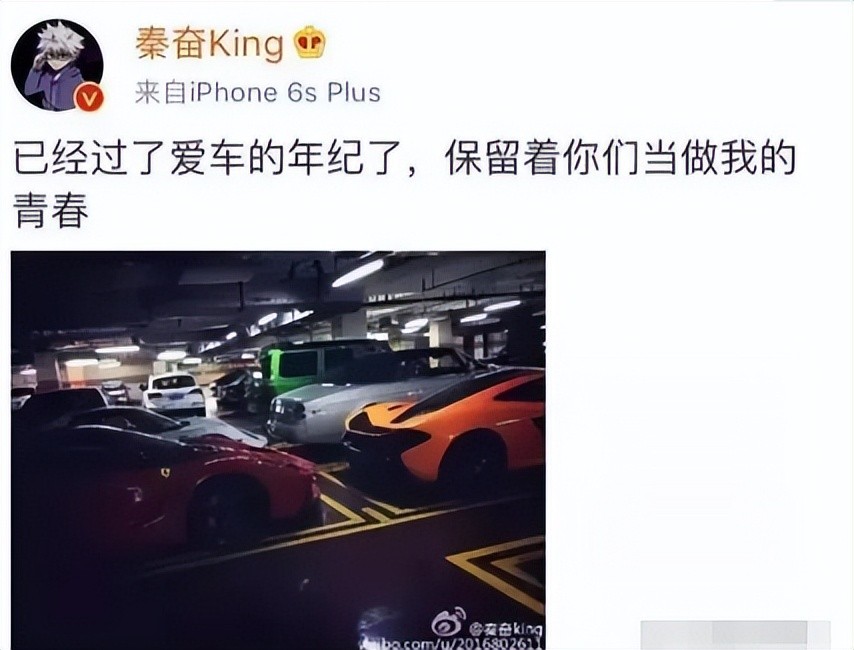 一时间,网上流传的新闻都是“如果王思聪是超级富二代,那秦奋就是顶级富二代”。而在之前他更新的一则动态中写着“已经过了爱车的年纪,保留你们当做我的青春,”