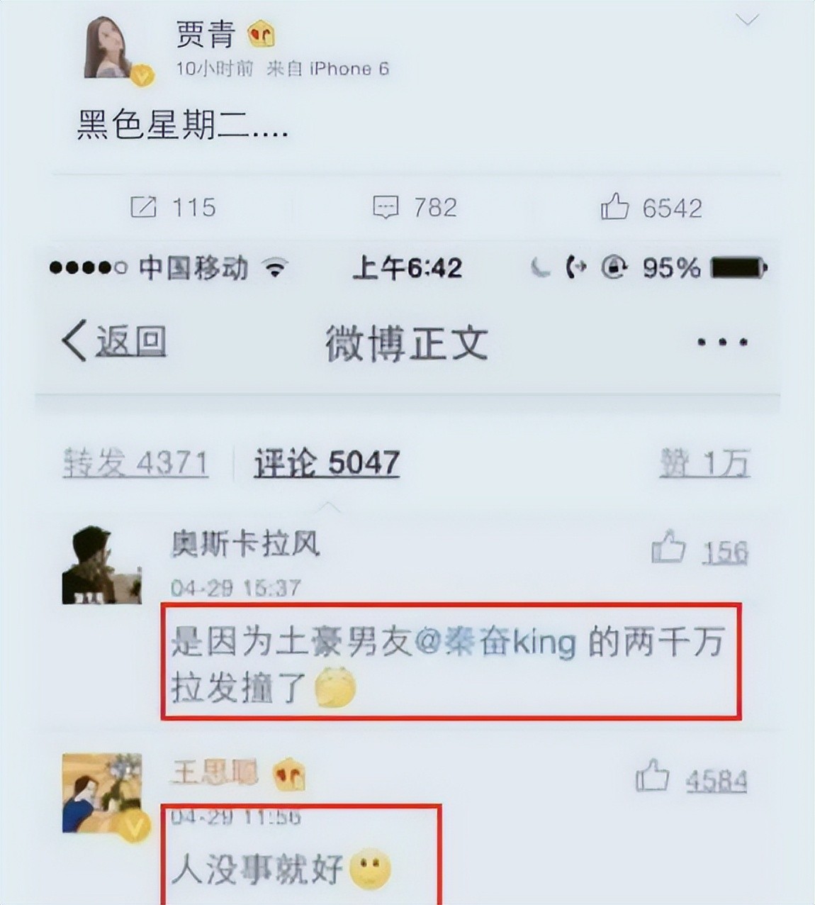 两人的恋情是在撞车事件中暴露的。在秦奋撞车的那天,贾青发布了一条“黑色星期二”的动态,于是便引起了大家的猜疑。