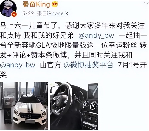 2018年的六一儿童节,秦奋为了感谢粉丝们对于他的关注,直接发文称随机抽取一位幸运粉丝奖励一台限量版的奔驰。