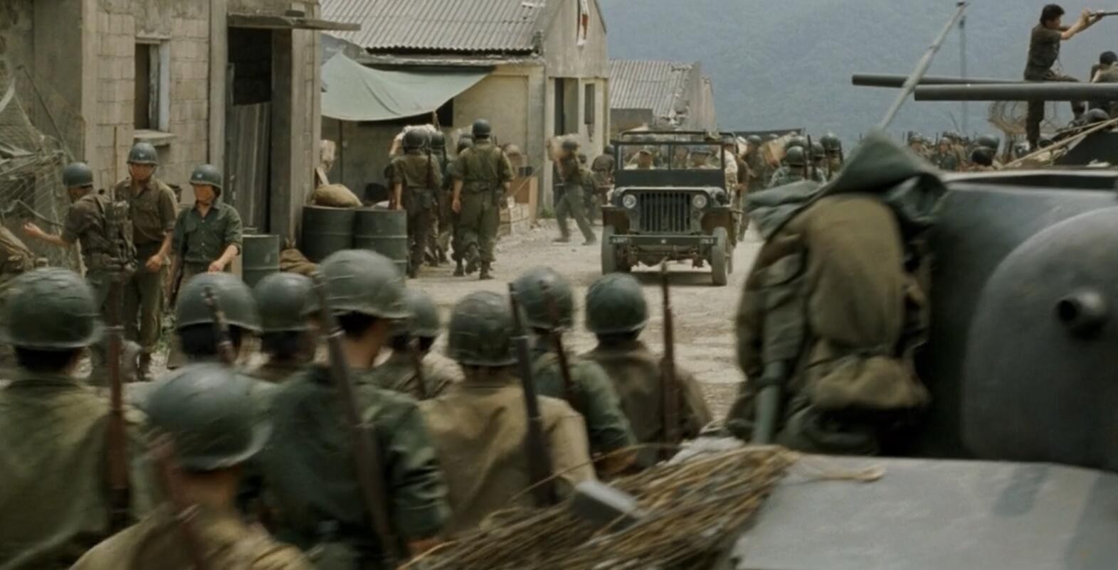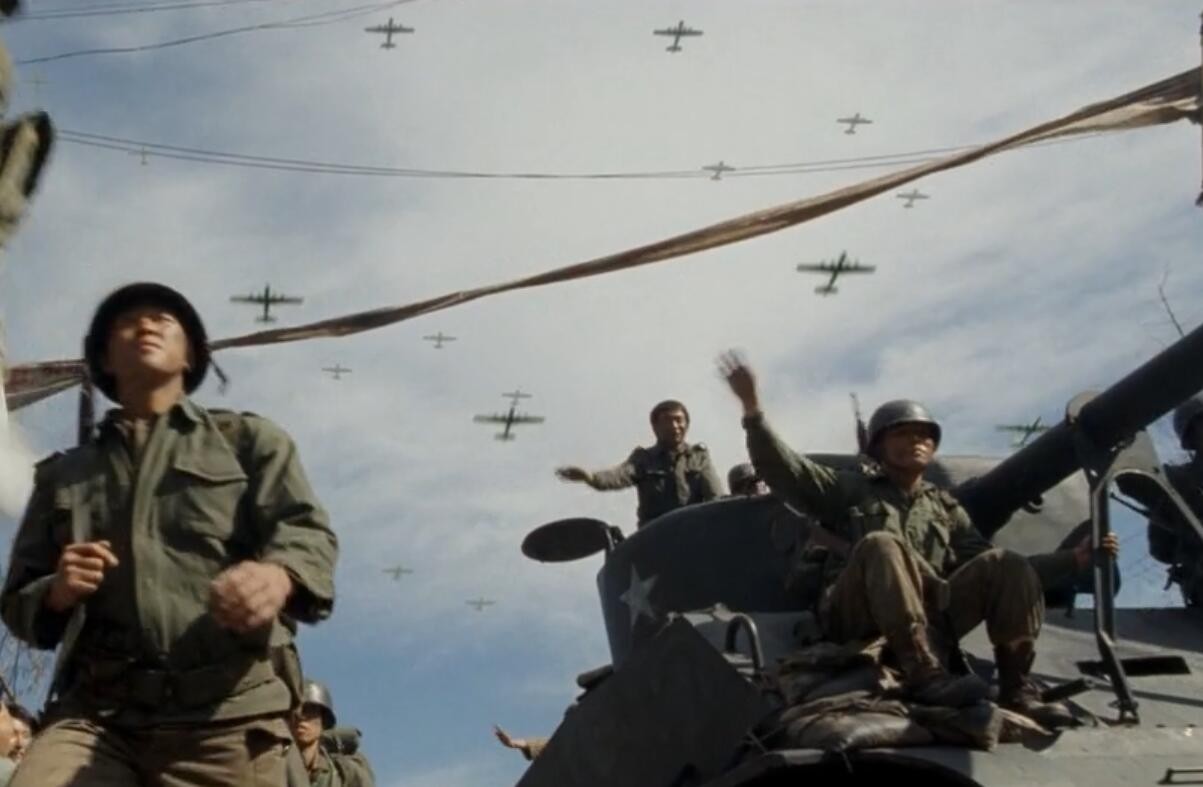 前方是美军重坦打头阵,后方是美军重炮给压阵,天上飞的是美军的战机,只有地上的步兵是全美械的韩军第1师团。