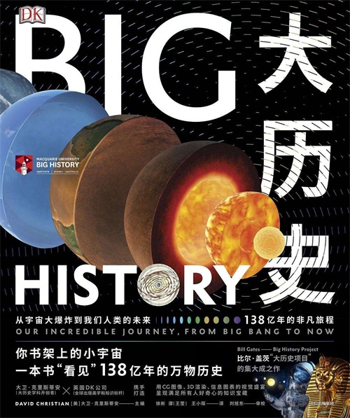 不过,推荐它的原因可不是因为它的重量,而是因为它的内容。这是一本特别好看的书,适合小朋友也适合大朋友。作者大卫·克里斯蒂安(David Christian)是牛津大学博士,主要任职于悉尼麦考瑞大学,2010年与比尔·盖茨一起成立了" 大历史项目",旨在研究人类、地球乃至宇宙的过去。