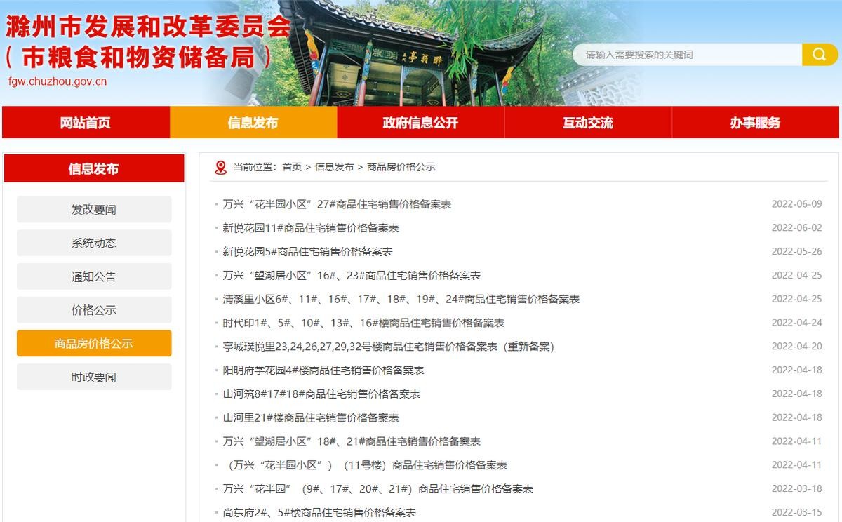 购房者在购房之前可以先查询一下意向楼盘的备案价格,可以大致了解新房销售价格大约在什么范围内,是否符合自己的预期价格。楼盘备案价格的查询方法以滁州为例,首先打开浏览器,使用搜索引擎查找滁州市发展和改革委员会的官方网站,在搜索结果中点击“滁州市发展和改革委员会”的官方链接,点击进入主页面。鼠标下滑至网站底部,找到“商品房价格公示”按钮,点击进入就可以查到滁州各项目最新的备案价格。也可在关键词搜索中输入楼盘名称,点击右边的查询按钮,就可以查找到这个楼盘楼栋在网站的所有备案价格。