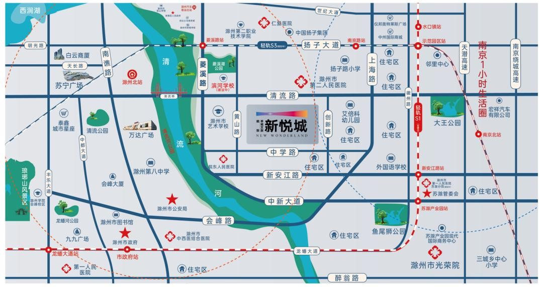 项目占地约113亩,用地面积约7.5万方,住宅占地约14万方,配有9班制幼儿园,占地面积不少于 5011㎡,另外小区配有约3800平方的商业配套可以满足业主的日常所需。周边近享苏宁(在建)、吾悦、邻里中心等商业;滁南九年一贯制学校工程项目位于全椒路与敬梓路东南侧,距清风系朗月书院约50米,计划2022年9月建成投入使用,滁州市一院南院区、南京儿童医院滁州分院等优质资源加持下,城南日渐朝着主城区看齐。