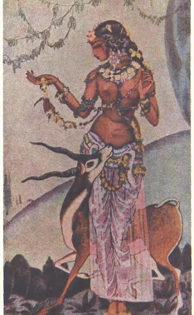 《沙恭达罗》主要讲述了:国王豆扇陀到郊外去打猎,为追逐一只小鹿而闯入净修林,在此见到了美妙绝伦的少女沙恭达罗,两人一见钟情。从此,少女的心中充满了爱情,一天,她在森林里对女友诉说心事,恰被豆扇陀窥破真情。他激动地从隐蔽处走了出来,大胆地向她表示了真挚的爱。他们以自己的方式举行了婚礼。可是,婚后的豆扇陀不得不返回京城,行前,他将一枚刻有自己名字的戒指,作为信物交与沙恭达罗。