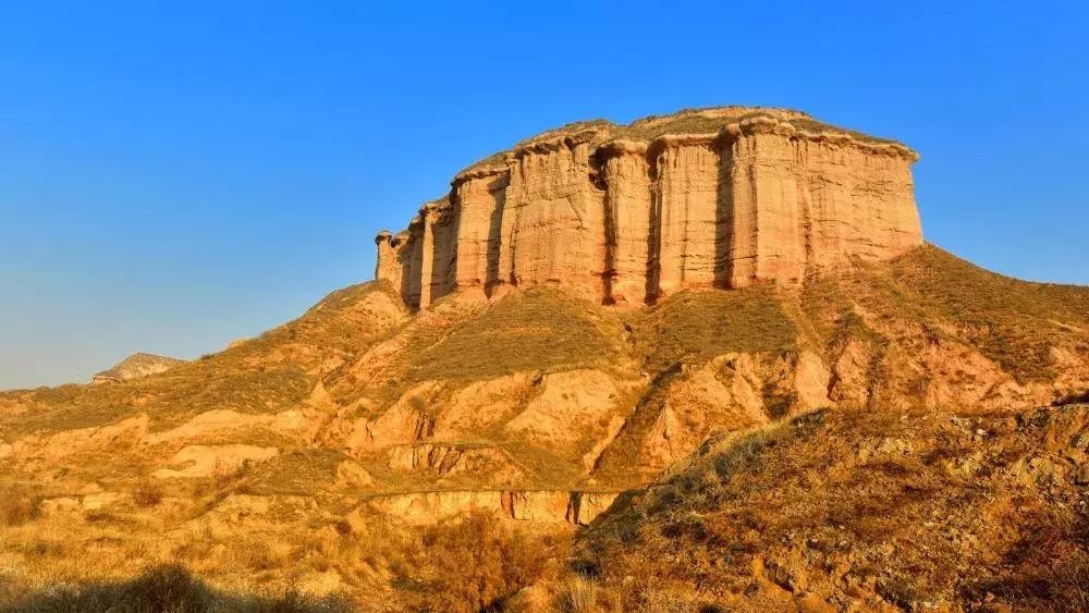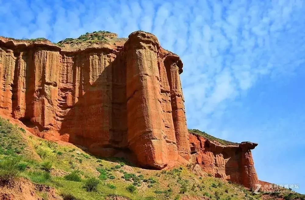 干燥的黄土帽和帽下疏松的橘红色砂岩对雨水的吸收力极强。下雨时,雨水会直接渗透这两套地层,但下渗的水到达下部胶结坚硬、渗水性差的砾岩顶面时,就不能继续下渗了,就顺沟壑垂直而下,向下淋滤。加之沟壑又是胶结比较疏松的厚层砂砾岩,便将其淋蚀、冲刷成直立的沟槽。而未被淋蚀、冲刷的部分就形成凸出的石柱状。又因砂砾有硬有软,且整套岩层近乎在一个水平面上,所以直沟槽的立面有向外凸出的和向里凹进的,使这套岩层酷似外部带有大形石柱的多层楼阁。其上的薄层砾岩层坚硬而不易被水冲蚀,突出于石柱之外,便形成了楼阁的层檐。砾岩上的橘红色砂岩因松软易被雨水冲刷,周围形成斜坡,仿佛成为这一楼阁群的屋顶。这里沿沟两壁的地层,经过雨沙长期浸蚀,便形成了曹家湾一带各式各样的风蚀柱、风蚀塔、风蚀磨菇云等等地貌。落仙塔、飞燕塔、擎天柱、三色塔、姊妹塔等奇观的存在,使人感到大自然神刀鬼斧般的奇妙造化,堪称丹霞地貌一绝。
