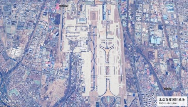 中国4F级民用机场,在北京朝阳区,该机场拥有三座航站楼,面积共计141万平方米;有两条4E级跑道、一条4F级跑道;机位314个;开通国内外航线252条。(注意看跑道,有架大客机)