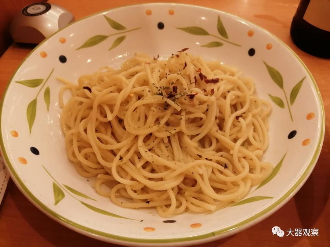 因为点了两道主菜所以意粉简单一些,蒜蓉味很浓郁意粉的口感我非常喜欢,这份意面也体现了一家日企的特点;萨莉亚走的是中央厨房模式,所有菜式都是配送现场加热上摆盘的,唯有意面是现煮,精准的调味和煮面时间让这道简单的意粉显得不一般。