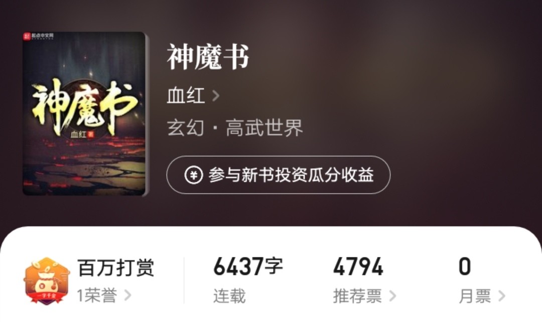 白金大神血红新书《神魔书》上线,百万打赏,登顶起点新书榜!