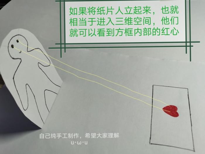 当二维世界中的纸片人“立了起来”进入三维世界,他们立刻能感到高的存在,而他们也能看到之前看不到的物体内部。