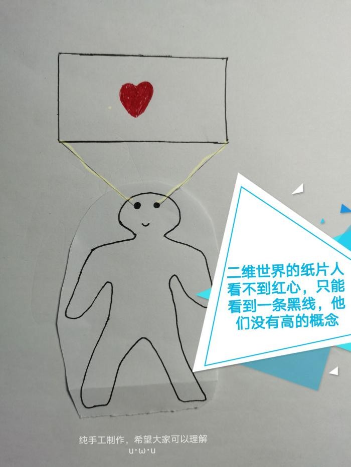 生活在二维世界里的纸片人只有长和宽两个维度,没有高的概念,所以他们的世界是由一段段“线”构成的,他们也无法看到二维世界中物体内部的事物,更无法想象出三维世界的样子。