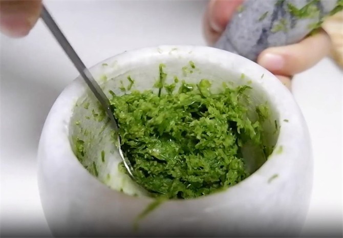 4.韭菜花捣好之后,再捣一些姜蒜。
