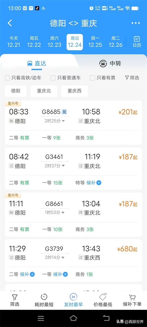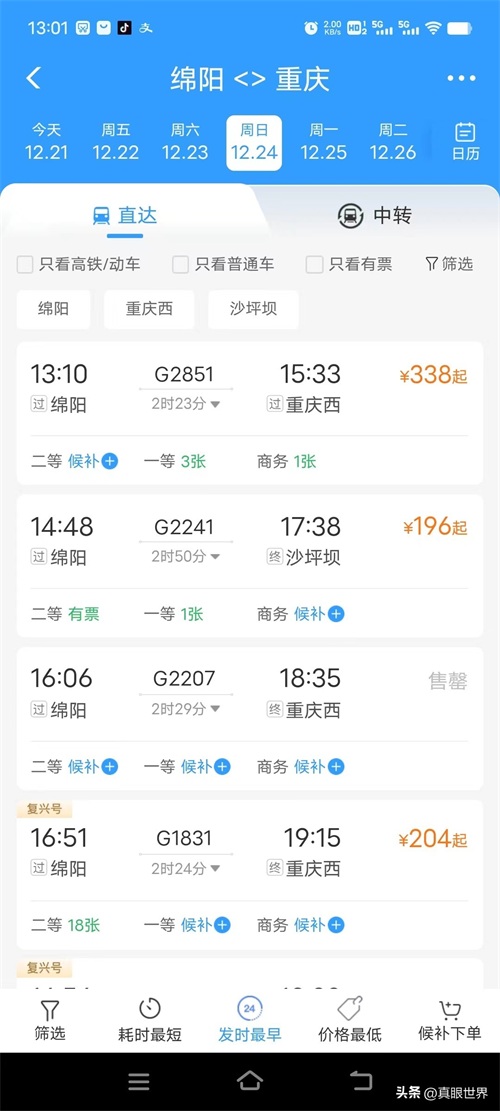 2、绵阳去重庆,均为12:00时后到达重庆。且只能以重庆西和沙坪坝为终点,没有重庆北。而重庆机场距重庆北最近。