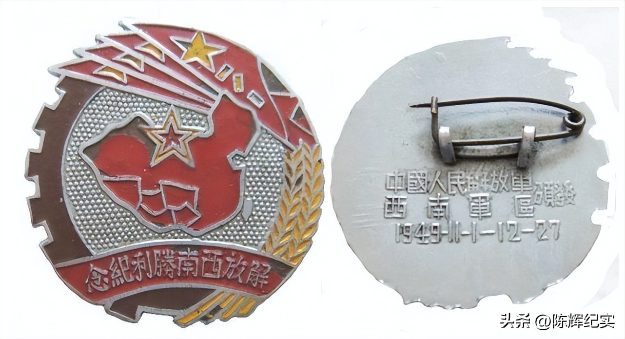 1949年底,西南军区为纪念解放大西南,特向参战人员颁发“解放西南胜利纪念章”1枚。纪念章直径为3.8厘米,重约11克。纪念章正面上方是四面红色的“八一”军旗,每面军旗上面都有一颗红五星,分别代表参加解放西南战役的中国人民解放军三大野战军(“一野”“二野”“四野”)、湖南省独立一师、二师、桂滇黔边纵队等部队。