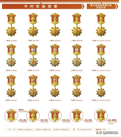 重大非战争军事行动奖励奖章,分为一等功、二等功、三等功奖章。平时、重大非战争军事行动一等功、二等功、三等功奖章主章通径分别为50mm、47mm、45mm。
