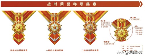 战时荣誉称号奖章,分为特级战斗英雄、一级战斗英雄、二级战斗英雄奖章,主要由军徽、枪、英雄花等元素构成。平时荣誉称号、重大非战争军事行动荣誉称号。奖章主要由军徽、红旗、光芒等元素构成。荣誉称号奖章主章通径均为60mm。