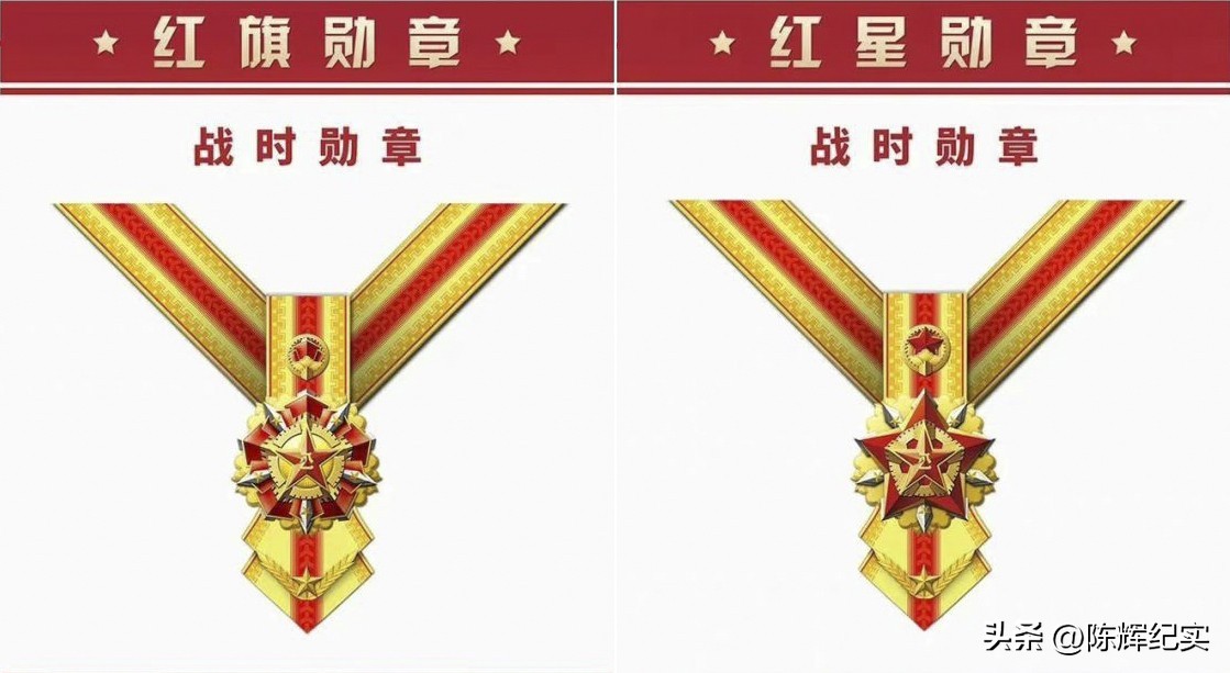 “红旗勋章”“红星勋章”是战时勋章,“红旗勋章”由军徽、红旗、令箭等元素构成,“红星勋章”由军徽、大红星、长城等元素构成。