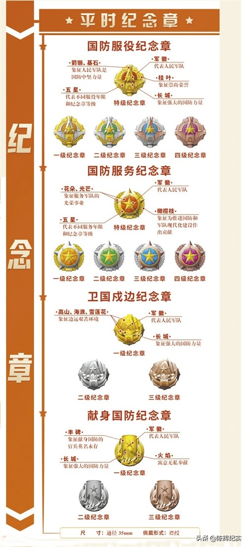 平时纪念章,分为国防服役纪念章、国防服务纪念章、卫国戍边纪念章、献身国防纪念章等,主要由军徽、长城、橄榄枝等元素构成,通径均为35mm。