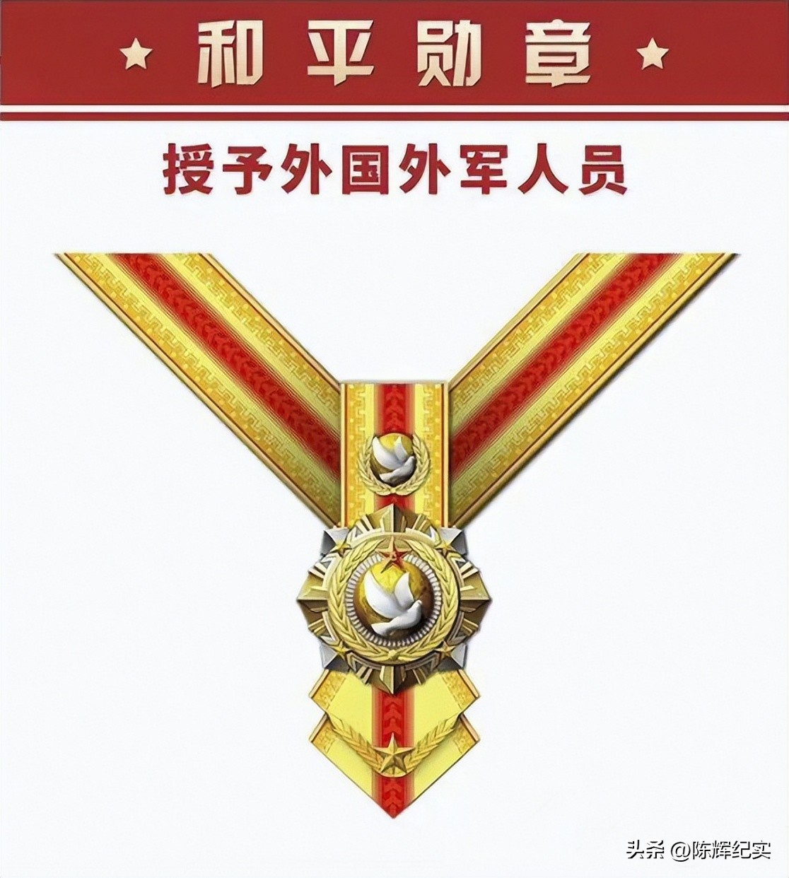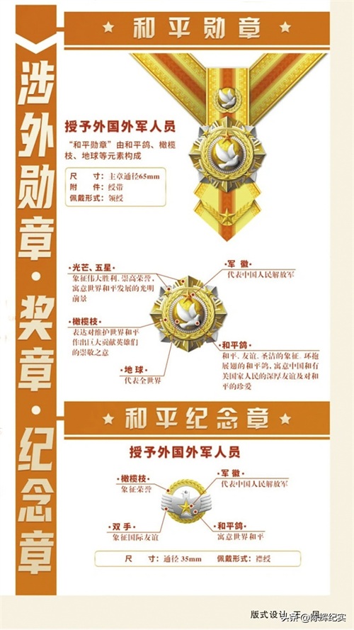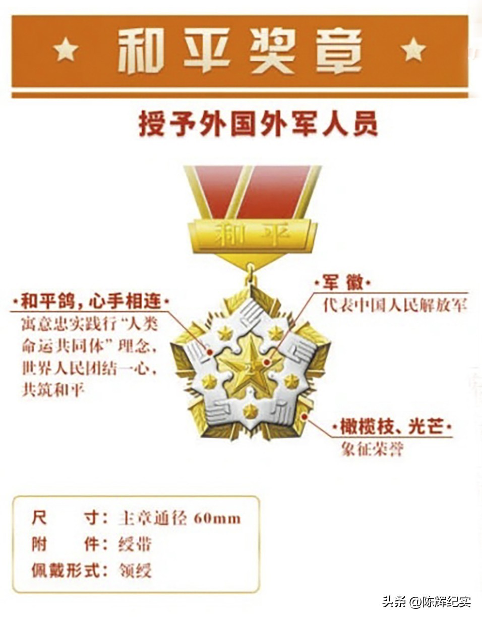 “和平勋章”由和平鸽、橄榄枝、地球等元素构成,授予外国外军人员。