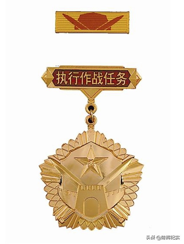 ——执行作战任务纪念章。纪念章章体为五角形,通体呈金色,周边图案是椭圆轨迹和宝剑剑身,中央图案是盾牌、中国人民解放军军徽、长城和在长城背后军徽下方相交叉的两把宝剑,并且剑尖和剑尾抵达章体边缘。 军徽代表中国人民解放军,盾牌和双剑表明人民解放军保卫祖国和人民的神圣职责,长城象征强大的国防力量。章体背面刻印每次执行作战任务的具体名称。